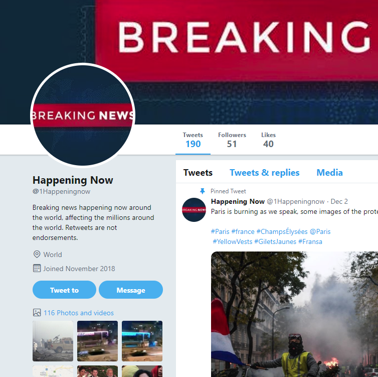 Concentrons-nous sur «Happening Now» (@1Happeningnow), qui ressemble à un média d’information. Le compte est relativement récent (créé il y a un mois) avec très peu d’adhérents, ne semble pas appartenir à une véritable société de médias (aucun site Web ne lui est associé) et, bien sûr, son auteur est anonyme. Il tente de dépeindre un Paris en feu comme sur le point de non-retour pour Macron (alors que, je peux vous l’assurer, c'est chaud près des points de protestation mais le reste de Paris se porte bien). Les sujets abordés ici sont également frappants : France, Ukraine, Russie, Afghanistan (hashtags les plus utilisés: #Paris, #Russia, #YellowVests, #Ukraine, #Macron). Encore une fois, on peut se demander qui est l'auteur de ces tweets et à quelles fins. |