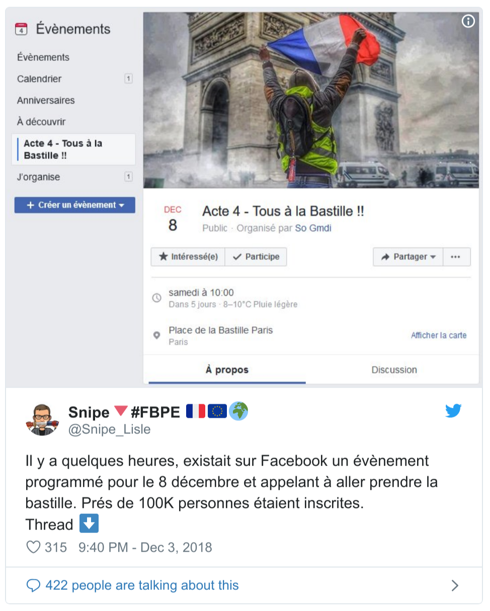 Nous avons déjà vu des agents extérieurs organiser des événements pour provoquer le chaos à l’étranger. Tout le monde a en tête les printemps arabes, Internet peut et va renverser un pays, même parmi les plus stables. Permettez-moi également de vous rappeler que la Russie a organisé 129 événements sur Facebook lors de la campagne électorale américaine de 2016 afin de s'immiscer dans les médias. Il semble que la même chose pourrait se passer ici en France :